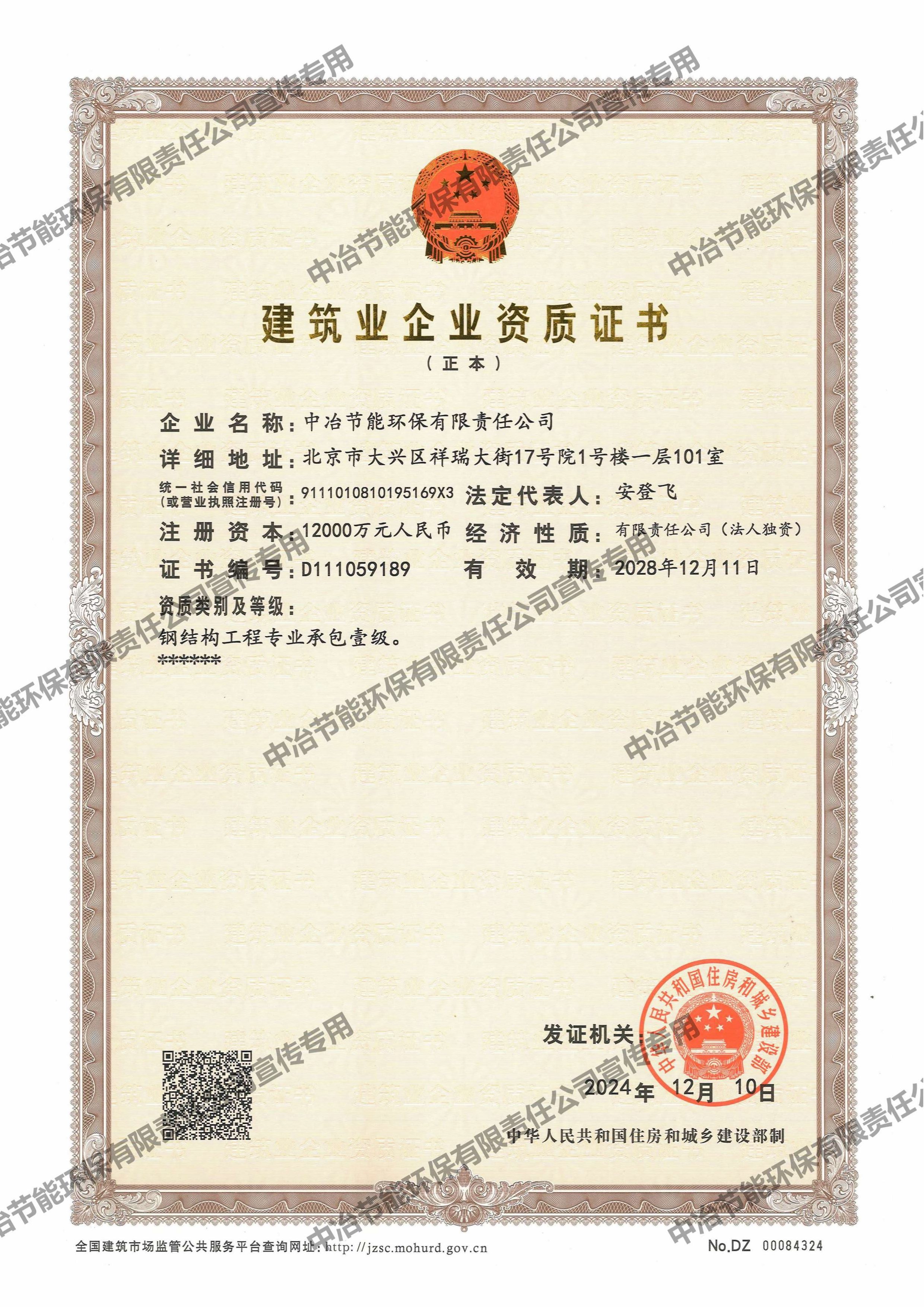 建筑業企業資質證書(鋼結構工程專業承包壹級)
